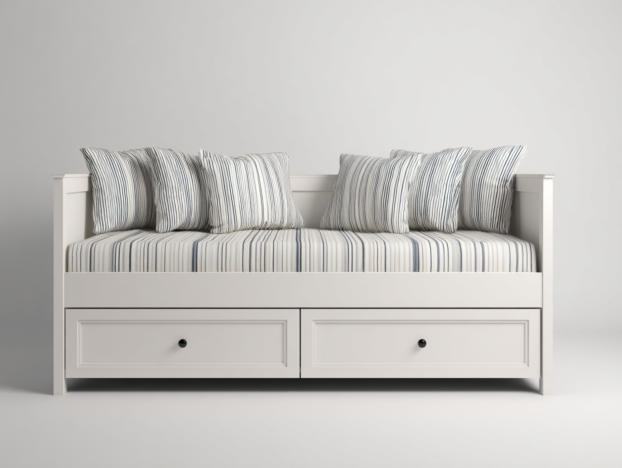 Das Möbelstück besteht aus Holz und Stoff. Die stabile Holzkonstruktion sorgt für eine zuverlässige Struktur im täglichen Gebrauch. Die Liegefläche ist mit Stoff bezogen, der eine angenehme Oberfläche bietet. Die Farbgestaltung in Weiß und Blau wirkt frisch und harmonisch und lässt sich gut mit verschiedenen Einrichtungsstilen kombinieren.