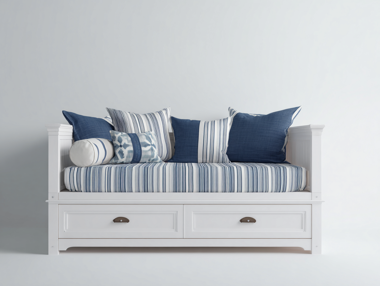 Das Möbelstück besteht aus Holz und Stoff. Die stabile Holzkonstruktion sorgt für eine zuverlässige Struktur und unterstützt eine langlebige Nutzung im Alltag. Die Liegefläche ist mit Stoff bezogen und bietet eine angenehme Oberfläche. Die Farbgestaltung in Weiß und Blau wirkt frisch und passt zu verschiedenen klassischen und modernen Einrichtungskonzepten.