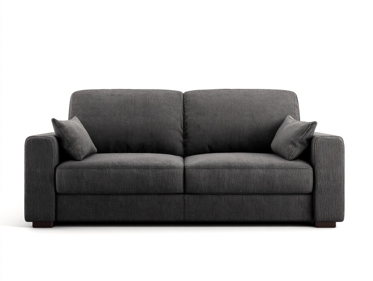 Der Bezug besteht aus widerstandsfähigem Stoff in Dunkelgrau und sorgt für eine angenehme Oberfläche im täglichen Gebrauch. Das stabile Holzgestell bildet die tragende Struktur des Sofas und unterstützt eine zuverlässige Nutzung. Die gleichmäßig verarbeitete Polsterung sorgt für eine ruhige Optik und eine komfortable Sitzfläche.